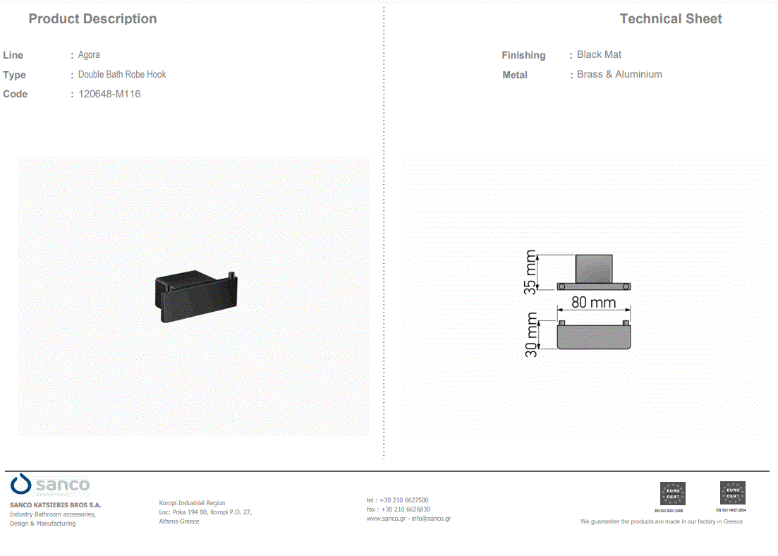 Άγκιστρο Διπλό Επιτοίχιο Black Mat Sanco Agora 120648-M116