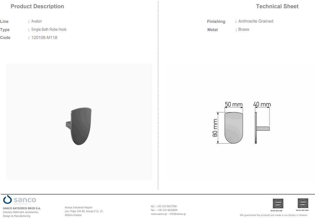 Άγκιστρο Μονό Επίτοιχο Sanco Avaton Antracite Grained 120108-M118