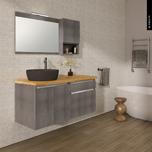 Έπιπλο Μπάνιου Μ120xB50xY55cm Βάση-Πάγκος Μασίφ Ξύλο Πεύκο-Νιπτήρας-Καθρέπτης-Φωτιστικό-Άνω Ντουλάπι Μελαμίνη σε MDF Cemento Savvopoulos Ultima 04-8763