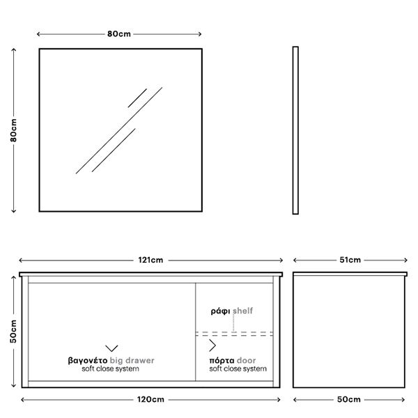 Διαθέσιμες διαστάσεις 121cm με νιπτήρα solid surface, σε οκτώ αποχρώσεις δρυς και 10 αποχρώσεις λάκας σε γυαλιστερή ή ματ υφή.