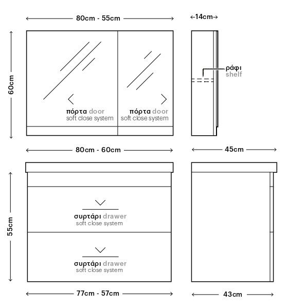 - Καθρέπτης Opera με ντουλάπι και δύο πόρτες soft close Μ60xΠ14xΥ60 & ράφι εσωτερικά