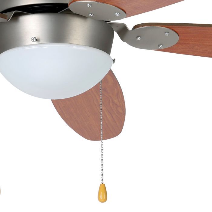 Κινητήρας AC κατασκευασμένος από μέταλλο σε νίκελ χρώμα και λεπίδες από ξύλο(MDF) βαμμένες σε καφέ χρώμα, ενώ η πηγή φωτισμού καλύπτεται από λευκό οπάλ γυαλί.