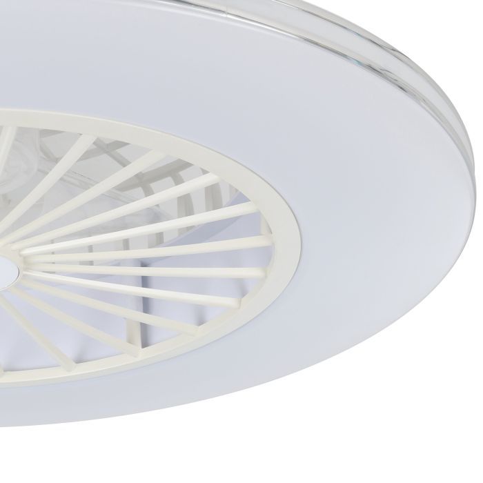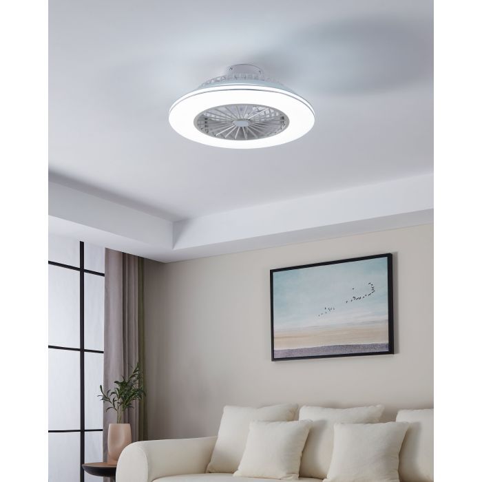 The LOVISCA ceiling fan features a compact body made from ABS plastic in a white finish and metallic silver accents.