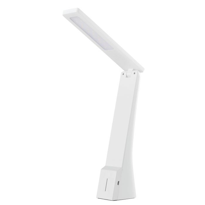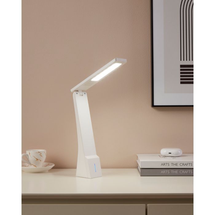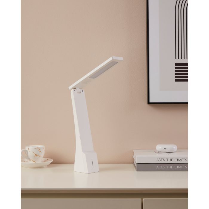 Επαναφορτιζόμενο φωτιστικό γραφείου της Eglo με ενσωματωμένο LED και αναδιπλούμενο βραχίονα, σε λευκό χρώμα.
