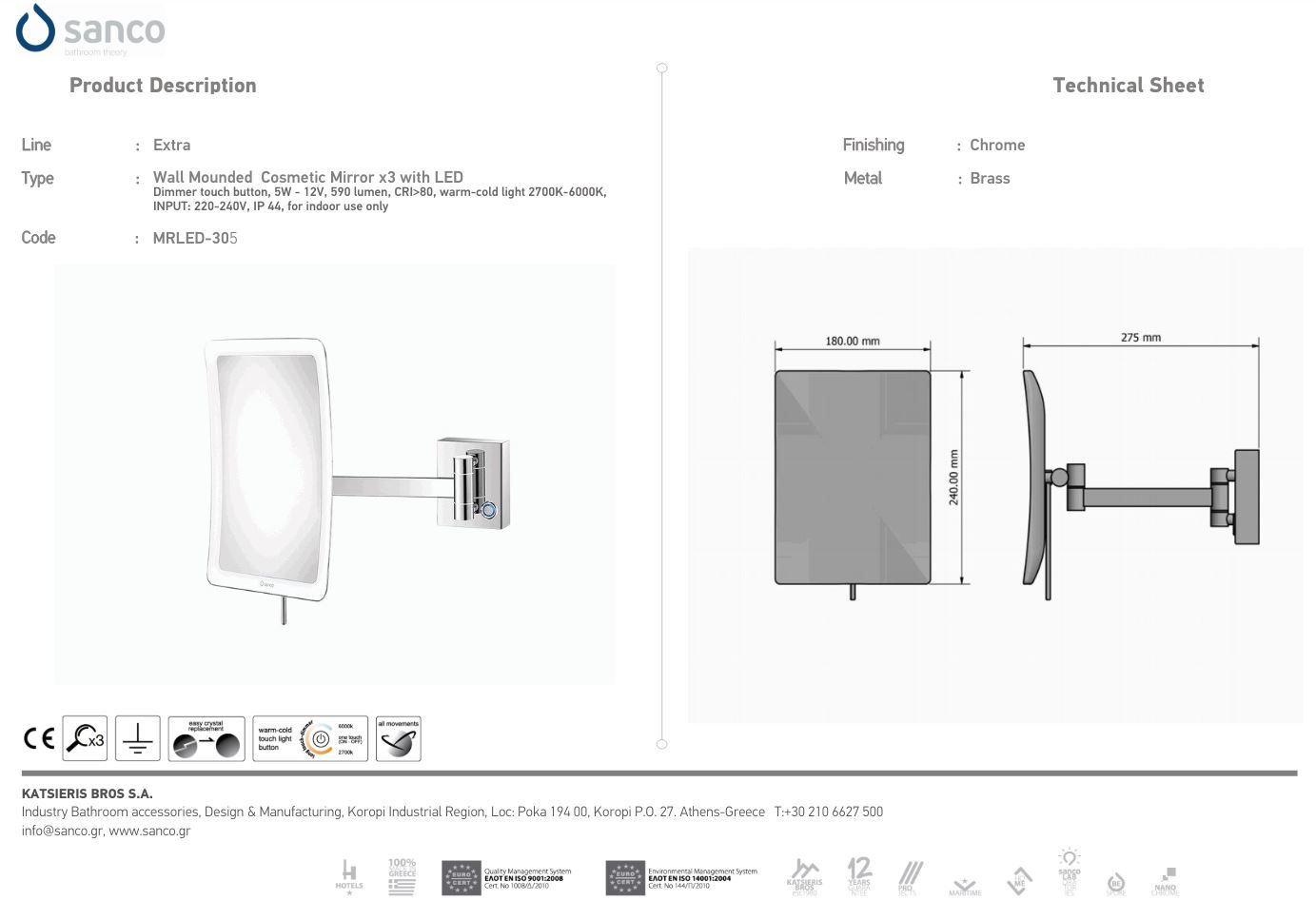 Επιτοίχιος Μεγεθυντικός Καθρέπτης x3 Led 5watt 220-240V IP44 Sanco Led Cosmetic Mirrors Brass Brushed MRLED-305-AB12