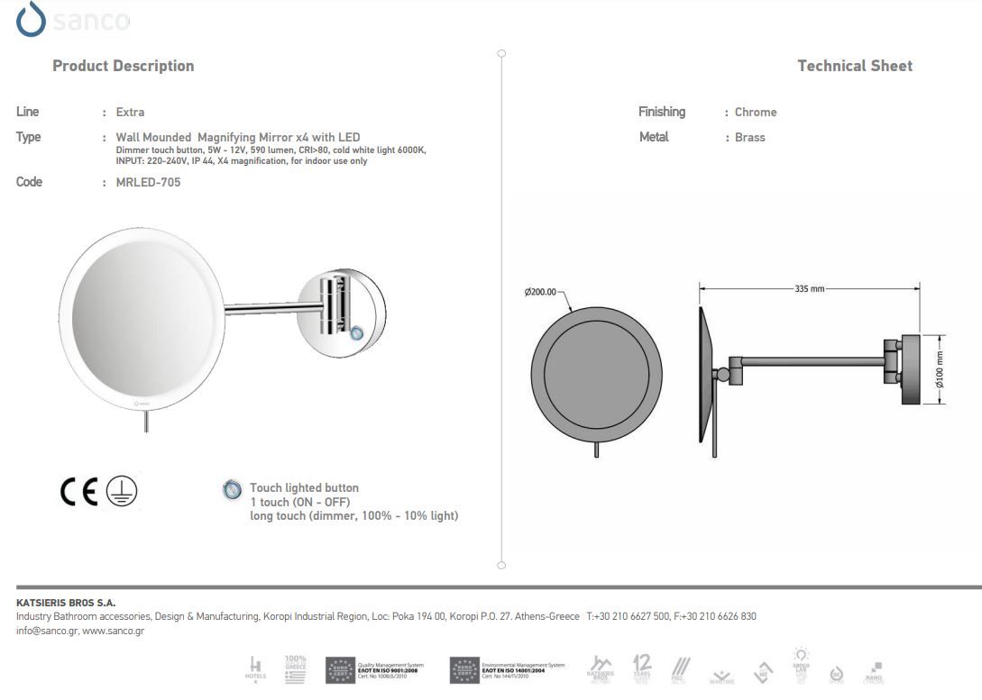 Καθρέπτης ΜεγεθυντικόςØ20*D33,5 cm IP44 5w Led 12V Ø20 εκ. Μεγένθυση *3 Brushed Gold 24K Sanco MRLED-705-AB5