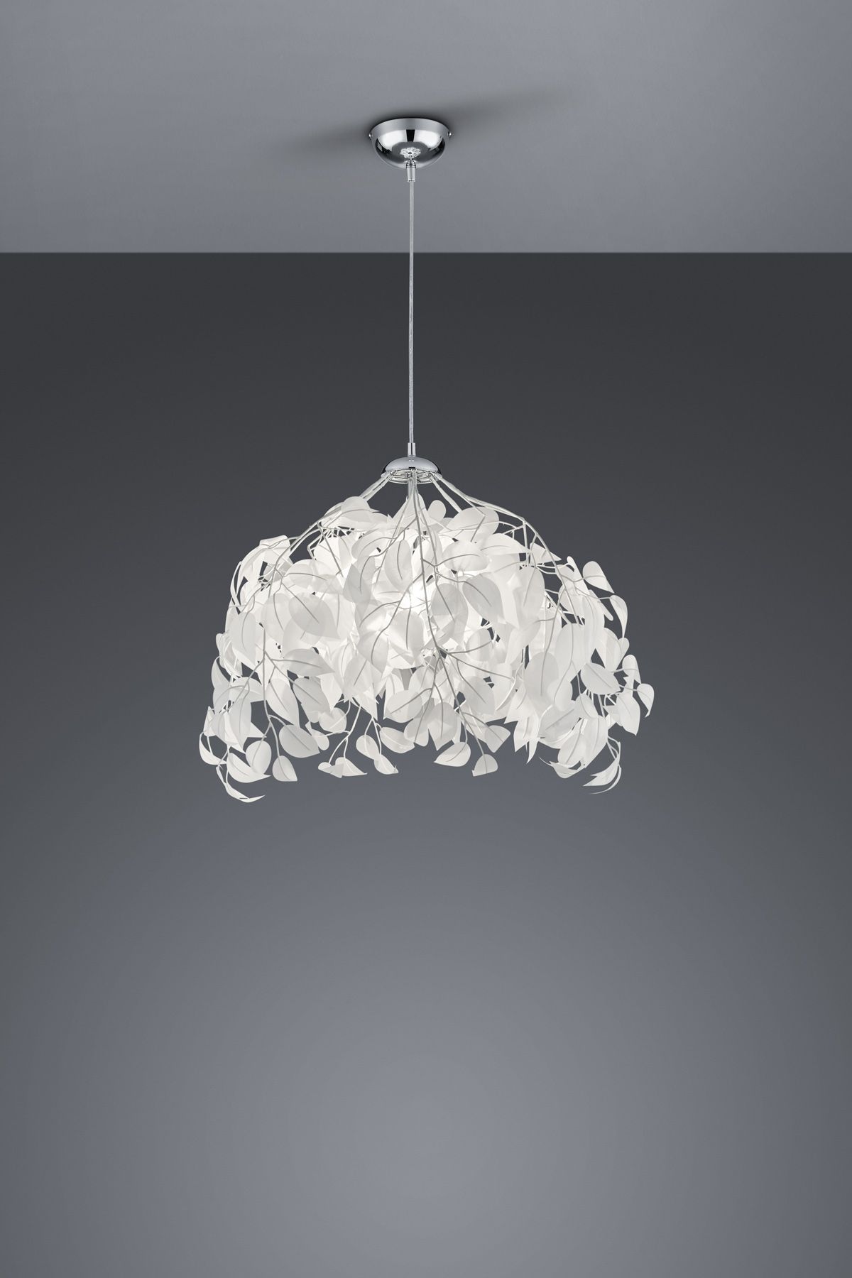 An enchanting lighting object for living areas whose style can be categorised as The white plastic leaves and the chrome-coloured canopy can be combined with other different colour concepts,