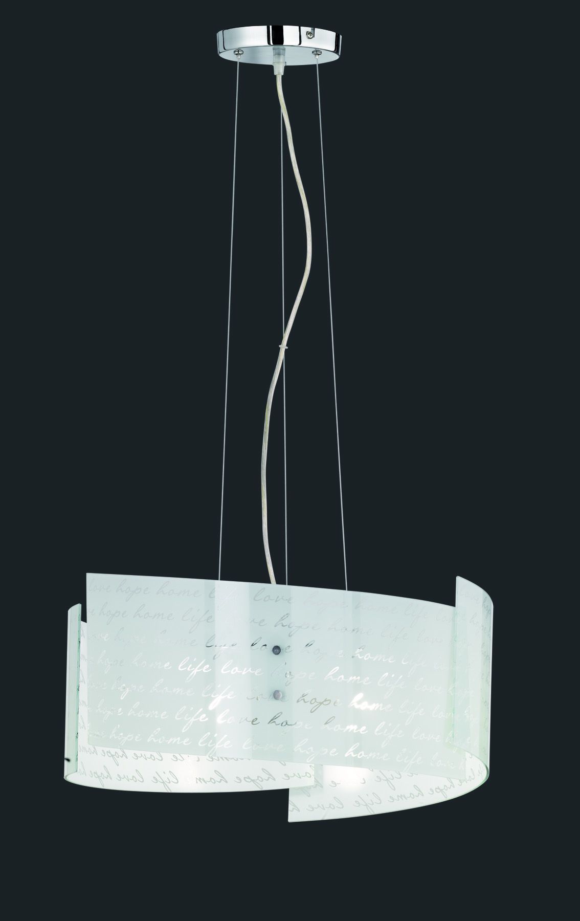 The SIGNA pendant light impresses with its simple and modern design. The satinised glass with clear lettering ''Hope.Home.Life.Love.'' emits a soft light over the side in addition to the downward beam of light. Thanks to the individual composition, the pendant light also provides small accents of light and fills the living and dining area with a harmonious ambience. The neutral colour scheme blends in perfectly with the surroundings, making it suitable for almost all living rooms and bedrooms, from classic to modern. The pendant light can be perfectly complemented by other lights from the SIGNA range. The pendant light has a diameter of 50 cm and a maximum suspension length of 150 cm, which can be individually determined during installation. The light is suitable for three light sources with an E27 socket and a maximum wattage of 40.