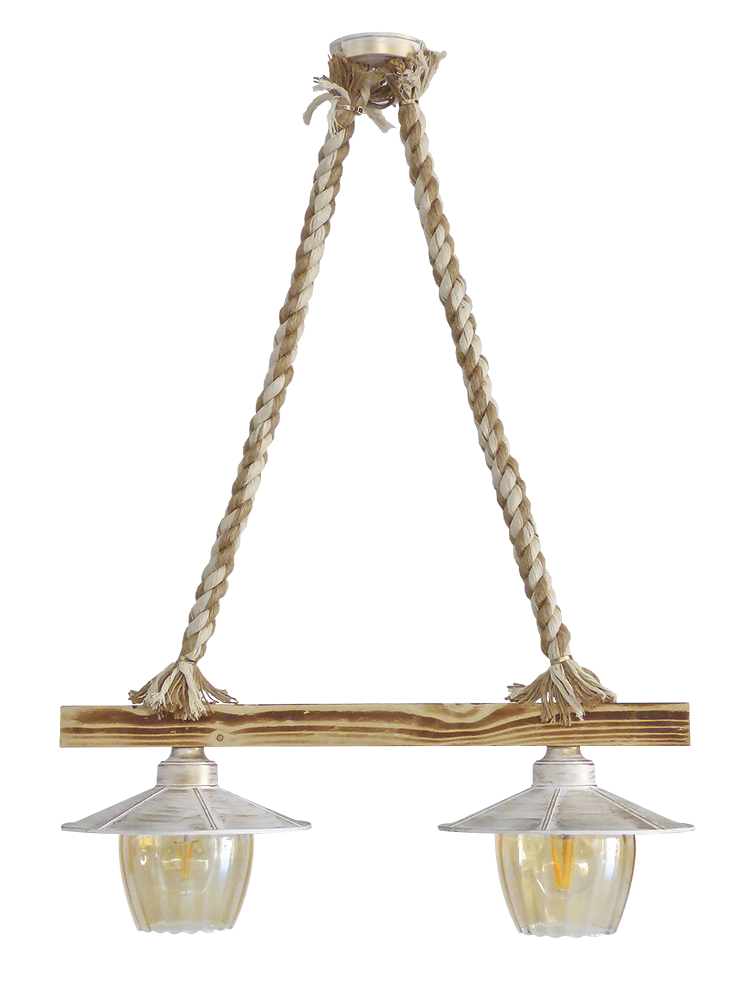 Κρεμαστό φωτιστικό 2/φωτο με ξύλινη ράγα και σχοινιά mix ,τα καπελάκια είναι σε χρώμα λευκό-μπρονζέ με μελί γυαλιά ΜΙΧ-98RAGA 2/L ROPE ΜΙΧ-WH-BR