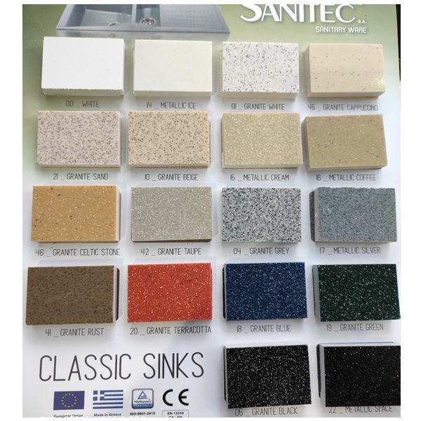 * Οι νεροχύτες Sanitec, απόλυτα εναρμονισμένοι με τις σύγχρονες τάσεις στη διακόσμηση, διατίθενται σε πολλές σειρές μοντέλων και σε μεγάλη ποικιλία αποχρώσεων "γρανίτη" και "ορυκτών μετάλλων".