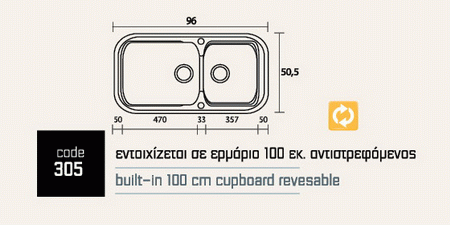 Περιγραφή: Νεροχύτης ένθετος αντιστρεφόμενος με 2 γούρνες