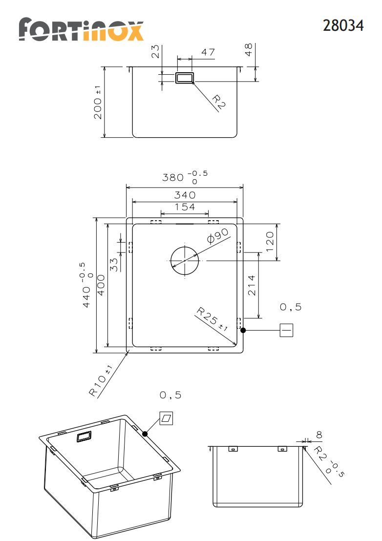Νεροχύτης Κουζίνας Ανοξείδωτος Υποκαθήμενος Squadro 38x44 Fortinox Inox Λείο 28034-110