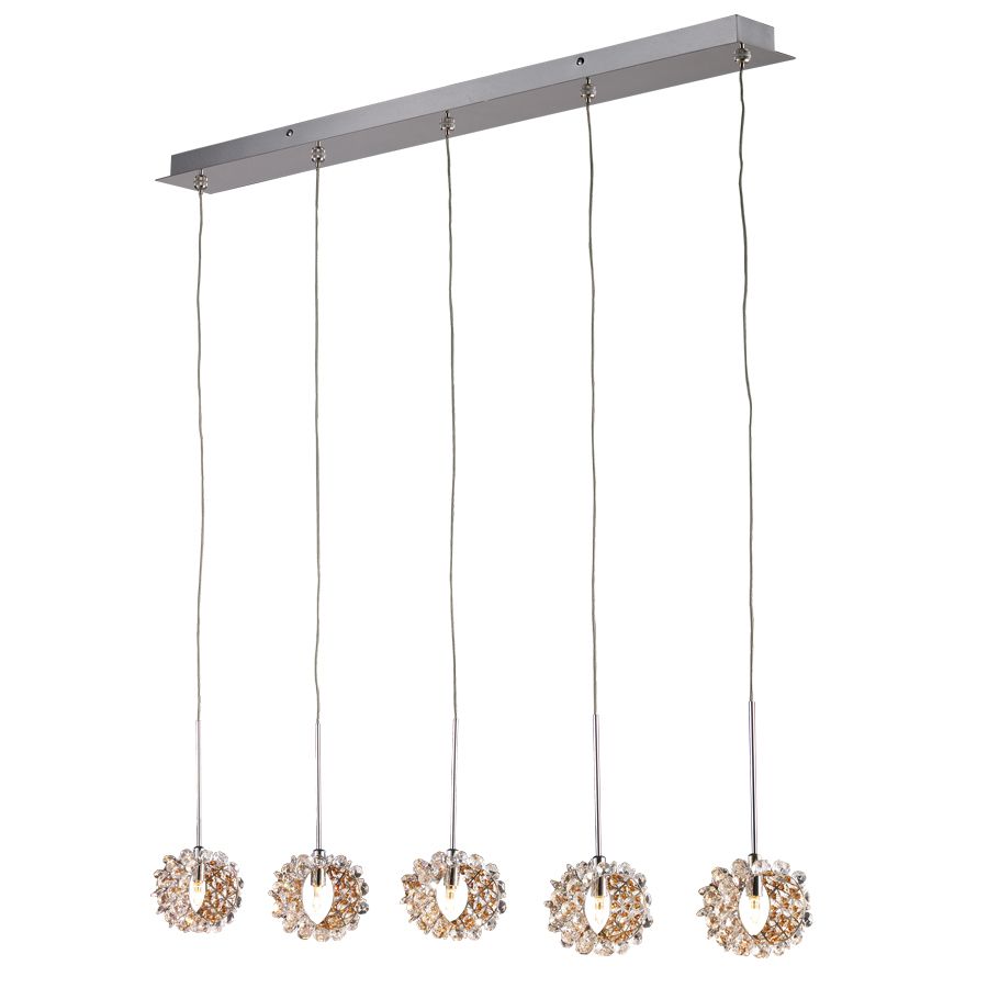 Κρεμαστό φωτιστικό(πεντάφωτη ράγα) με βάση από χρώμιοκαι διακοσμημένο με λευκά και μελί κρύσταλλα.Ύψος: 100 εκ.Μήκος: 80 εκ.Πλάτος: 8 εκ.Λαμπτήρες: 5 τεμ.Τύπος Λαμπτήρα: G4Watt: 35
