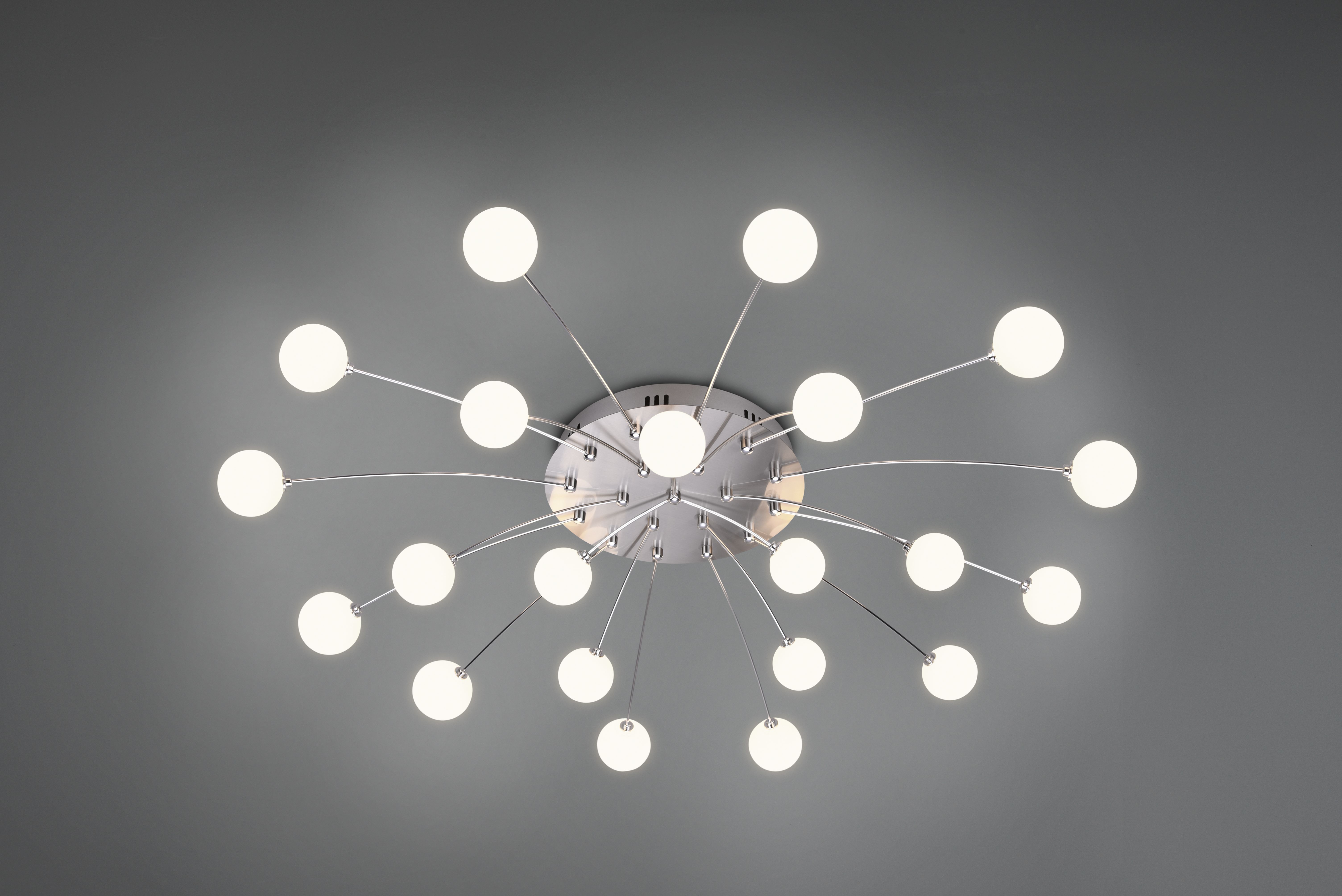 Thanks to the color design in matt nickel in combination with white glass shades, the luminaire leaves a modern appearance that can be integrated into almost all furnishing styles.