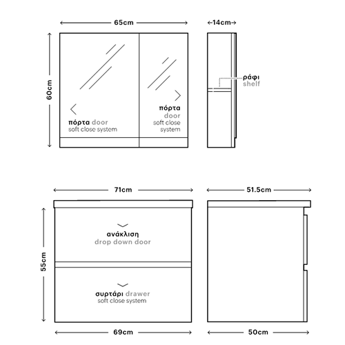 Η βάση του επίπλου διαθέτει δύο συρτάρια το ένα με ανάκλιση και δεξιά δύο ράφια. Στον αποθηκευτικό χώρο μπορείτε να αποθηκεύσετε πετσέτες, καλλυντικά και οτιδήποτε είναι χρήσιμο στην καθημερινότητά σας.