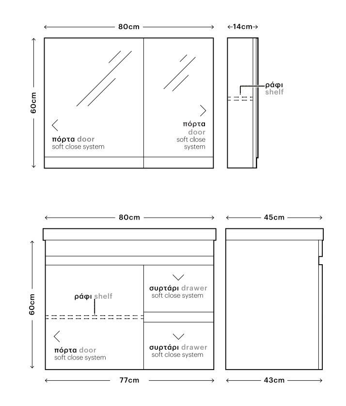 Διατίθεται σε διάσταση 80εκ. σε 7 Χρώματα Μελαμίνης, 10 Χρώματα Λάκας Γυαλιστερής ή Ματ καθώς και 8 Αποχρώσεις Δρυς Κόντρα Πλακέ Θαλάσσης