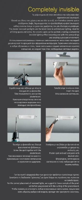Ιδανικά για όλους τους χώρους και για όλα τα στυλ, τα "frameless ceramic spots" επιδέχονται βαφή, δημιουργώντας την ψευδαίσθηση κρυφού φωτισμού,