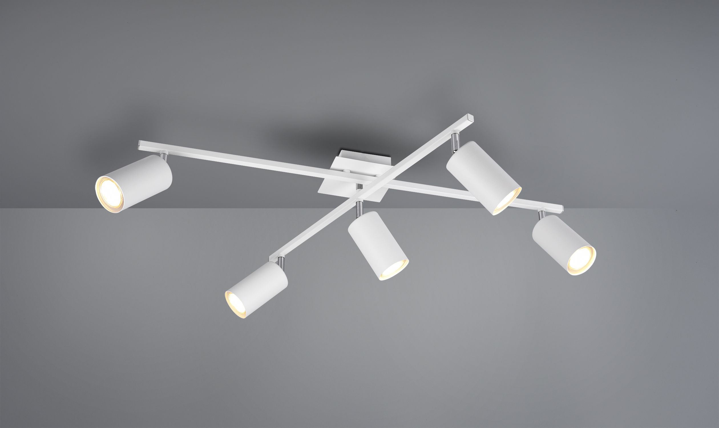 The arms and spotlights of the 5-bulb ceiling light are freely movable and can be individually aligned as required.