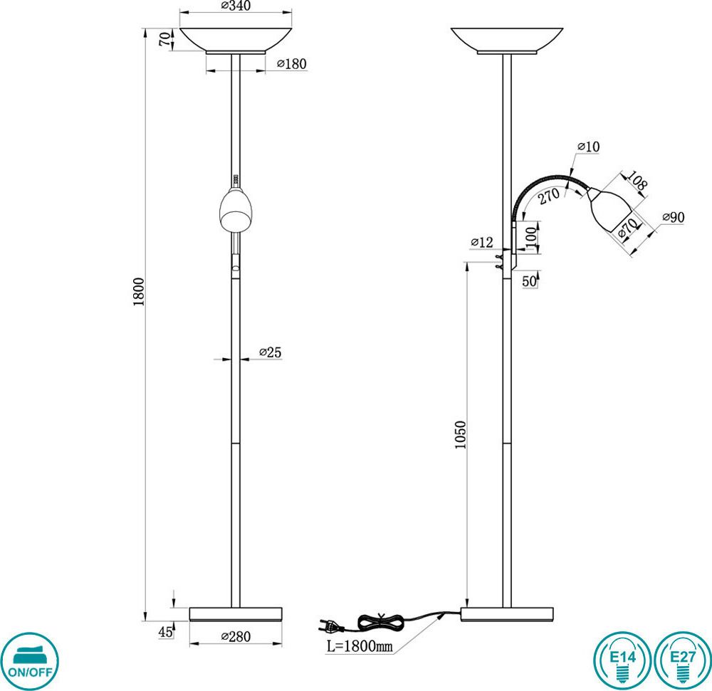 Διαστάσεις: Ø34 *Y 180 εκ.