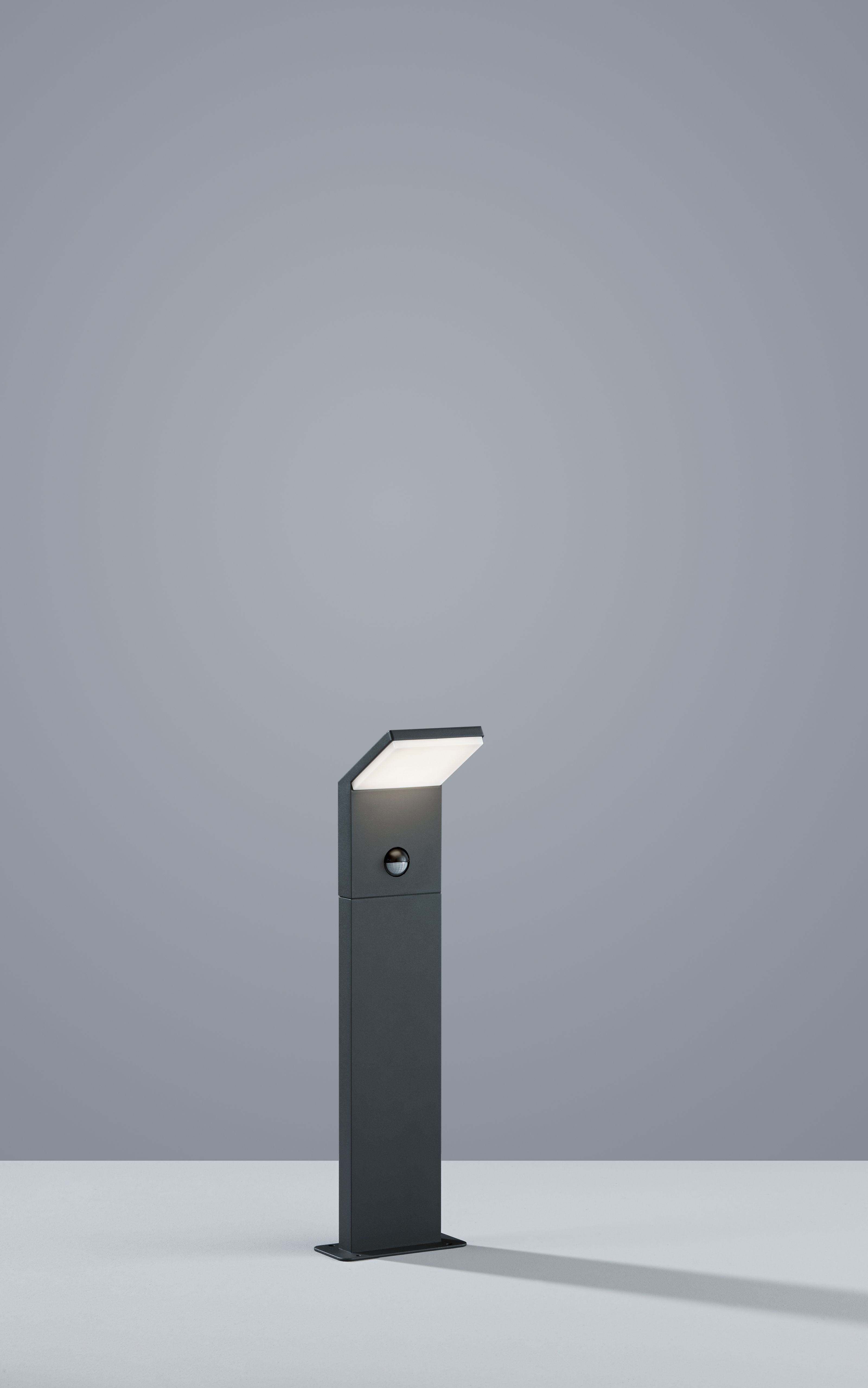 The bollard light impresses with a housing made of anthracite-colored die-cast aluminum and a slanted light shade made of white plastic.