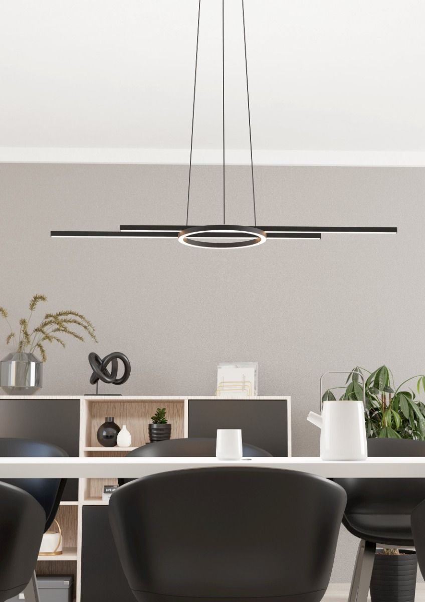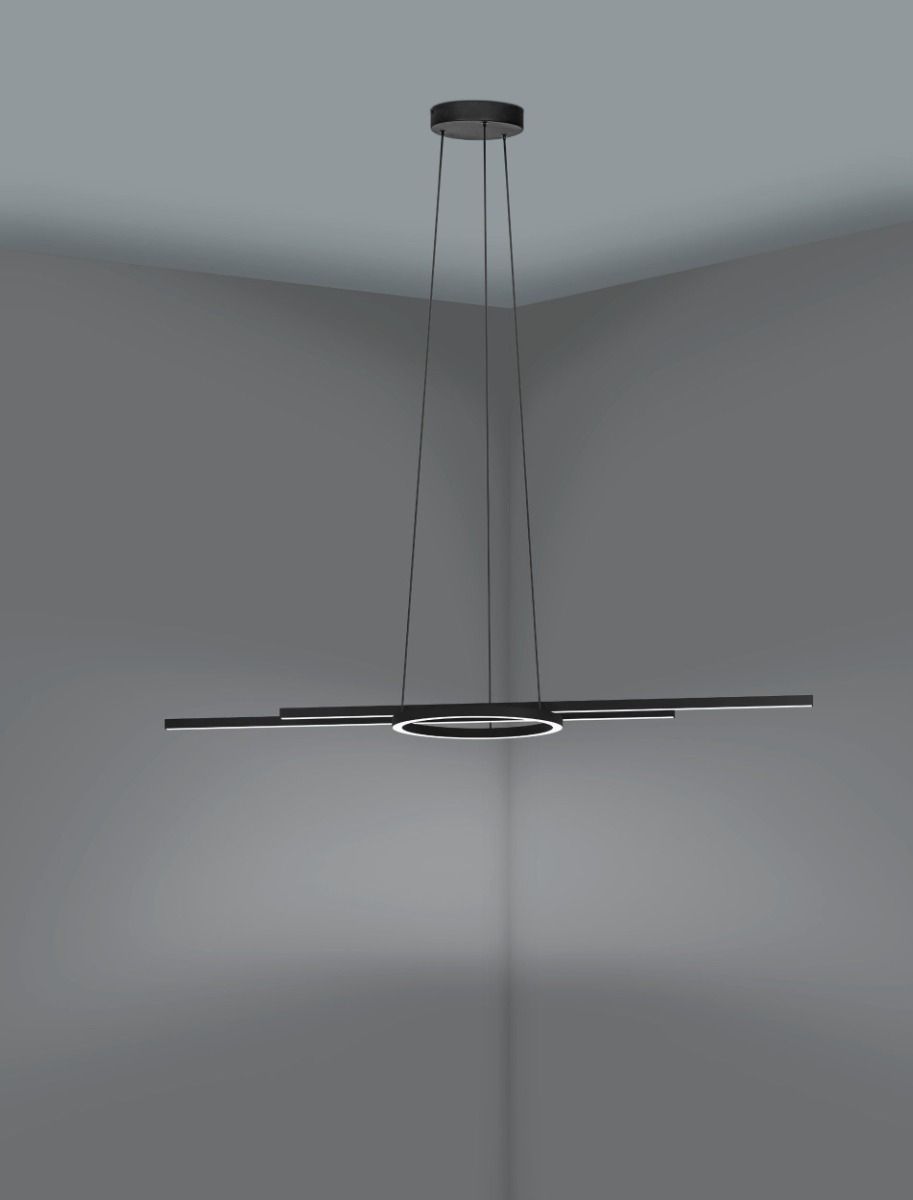 The ZILLERIO-Z LED pendant light is made from black metal and features two straight LED profiles and one ring-shaped LED profile.