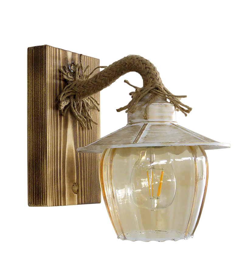 Απλίκα επιτοίχια ,ξύλινη με σχοινί ,πλαστικό καπέλο και γυαλί μελί R-98AP σε χρώμα λευκό-μπρονζέ Δεν συμπεριλαμβάνεται ο λαμπτήρας
