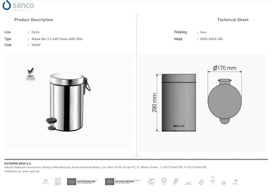 - Χαρτοδοχείο 5lt Χρώμα Dark Bronze Mat Soft Closιng Sanco Waste Bins 90680-DM25 Ειδική Τιμή 117,00 € Κανονική τιμή 130,00 €