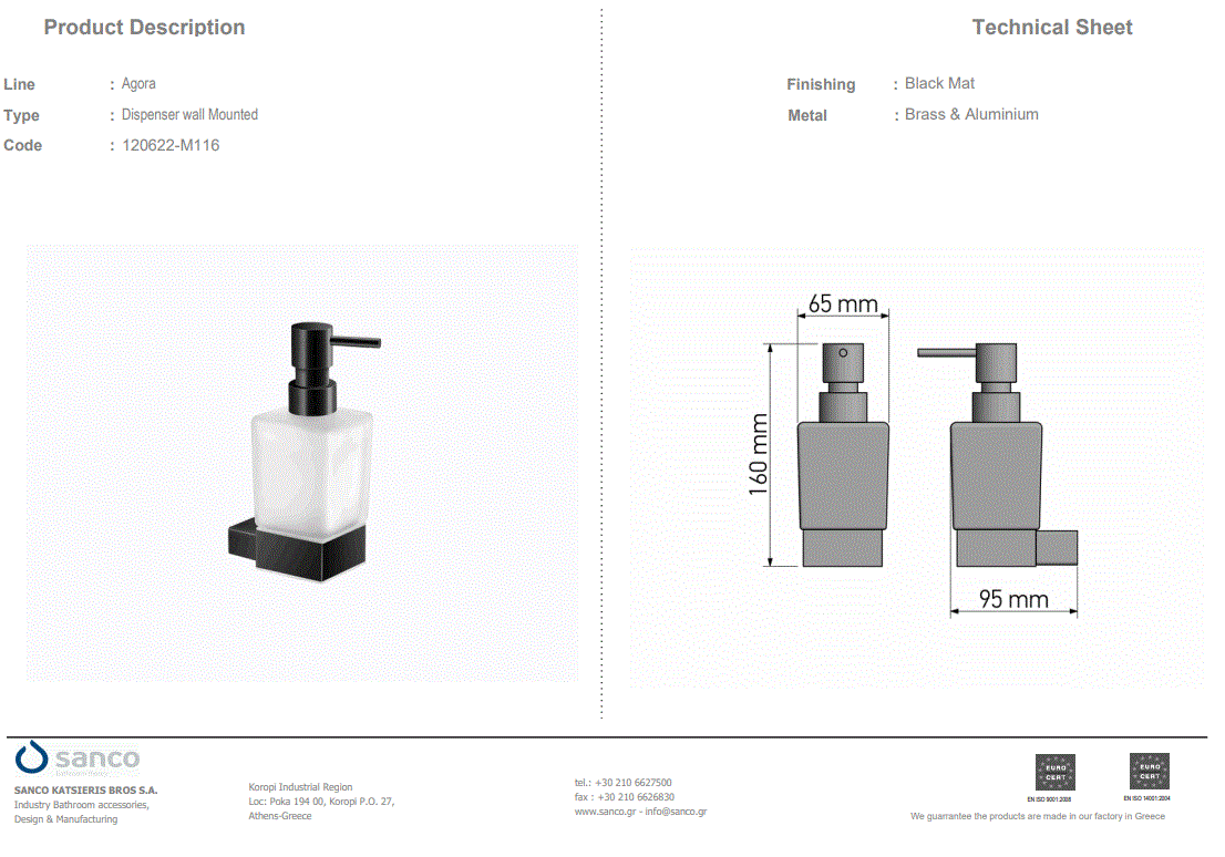 Dispenser Αντλία Σαπουνιού Επιτοίχια Black Mat Sanco Agora 120622-M116