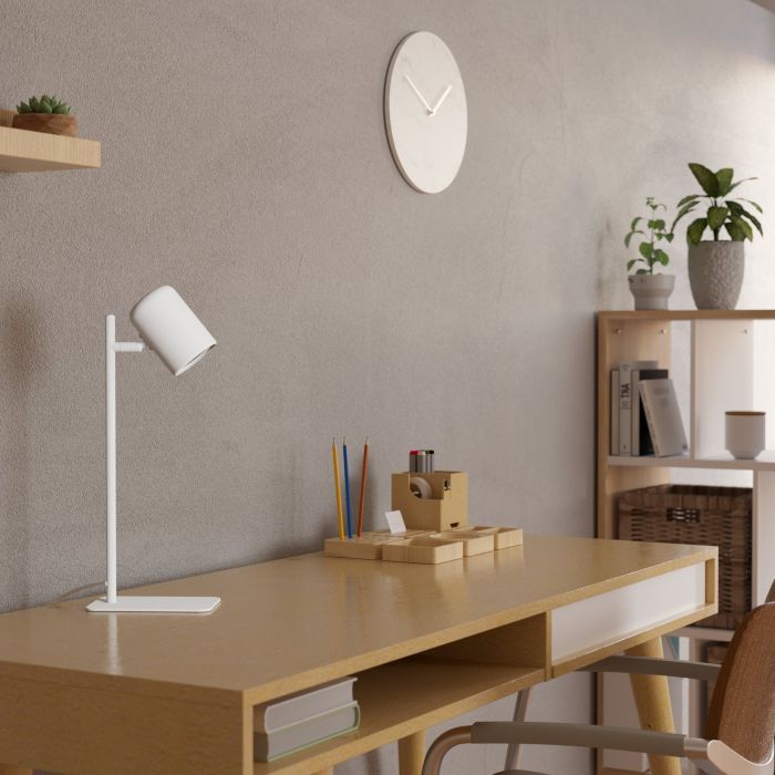 Φωτιστικό γραφείου της Eglo με ενσωματωμένο LED και άκαμπτο βραχίονα, σε λευκό χρώμα.