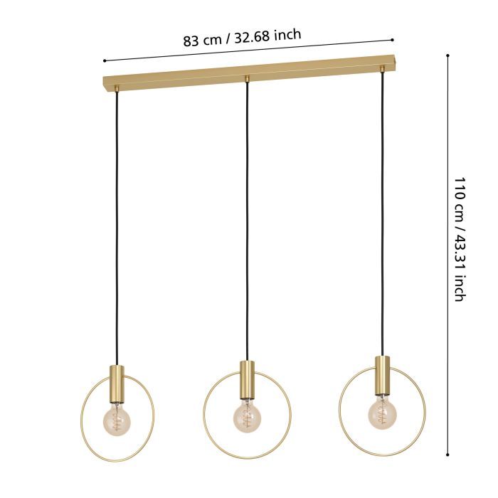 Τρίφωτο κρεμαστό φωτιστικό ράγα από την εταιρεία Eglo σε χρυσό χρώμα, με υποδοχές για 3 λαμπτήρες και ντουί E27. Διαθέτει vintage σχεδιασμό που προσδίδει στυλ και χαρακτήρα στον χώρο σας, ενώ ταυτόχρονα δημιουργεί μια ατμόσφαιρα που συνδυάζει την αισθητική του παρελθόντος με τον σύγχρονο σχεδιασμό. Είναι κατασκευασμένο από μέταλλο, ένα υλικό δημοφιλή στα κρεμαστά φωτιστικά οροφής, καθώς πέρα από τη μοντέρνα νότα που προσφέρει, είναι ιδιαίτερα ανθεκτικό στον χρόνο. Καθαρίζεται εύκολα με ένα πανί.