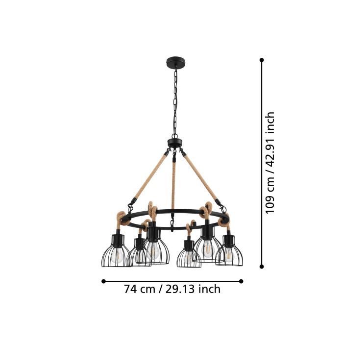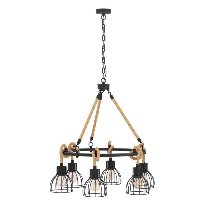 Πολύφωτο κρεμαστό φωτιστικό με σχοινί από την εταιρεία Eglo σε μαύρο χρώμα, με υποδοχές για 6 λαμπτήρες και ντουί E27. Διαθέτει vintage σχεδιασμό που προσδίδει στυλ και χαρακτήρα στον χώρο σας, ενώ ταυτόχρονα δημιουργεί μια ατμόσφαιρα που συνδυάζει την αισθητική του παρελθόντος με τον σύγχρονο σχεδιασμό. Είναι κατασκευασμένο από μέταλλο, ένα υλικό δημοφιλή στα κρεμαστά φωτιστικά οροφής, καθώς πέρα από τη μοντέρνα νότα που προσφέρει, είναι ιδιαίτερα ανθεκτικό στον χρόνο. Καθαρίζεται εύκολα με ένα πανί.