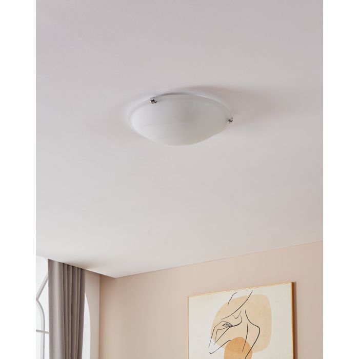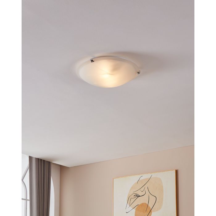 Κλασική πλαφονιέρα οροφής της Eglo σε ασημί χρώμα, από γυαλί. Διαθέτει ντουί για λαμπτήρες E27.