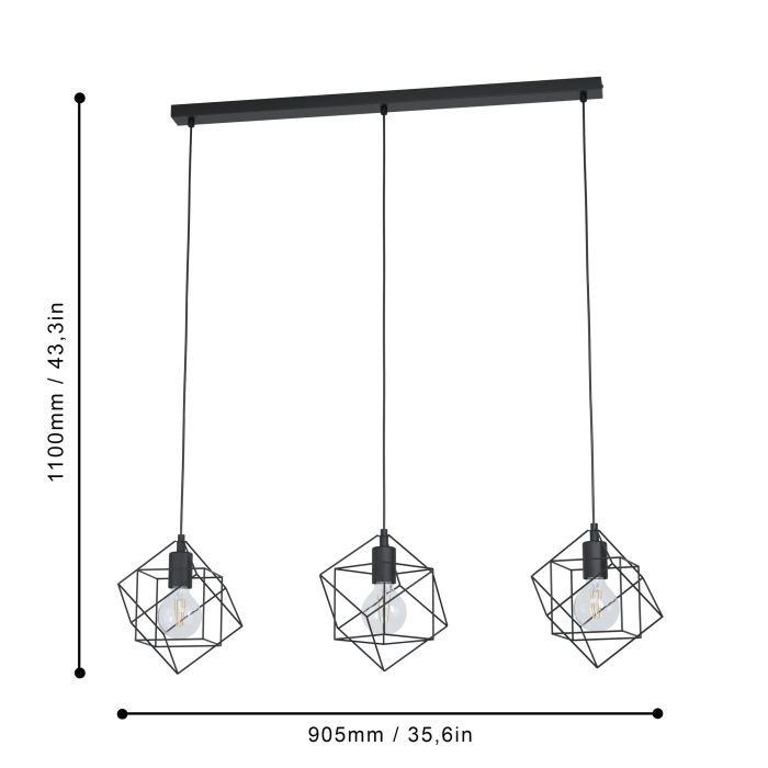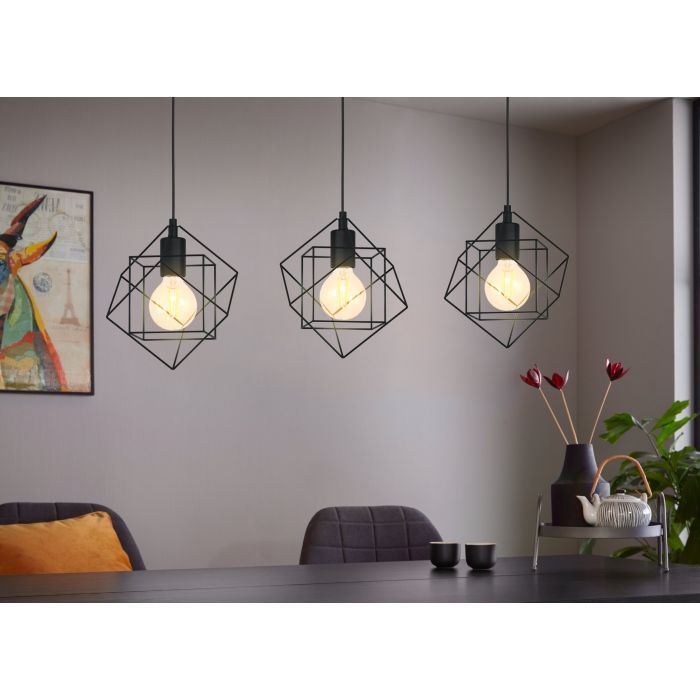 Τρίφωτο κρεμαστό φωτιστικό πλέγμα από την εταιρεία Eglo σε μαύρο χρώμα, με υποδοχές για 3 λαμπτήρες και ντουί E27. Διαθέτει vintage σχεδιασμό που προσδίδει στυλ και χαρακτήρα στον χώρο σας, ενώ ταυτόχρονα δημιουργεί μια ατμόσφαιρα που συνδυάζει την αισθητική του παρελθόντος με τον σύγχρονο σχεδιασμό. Είναι κατασκευασμένο από μέταλλο, ένα υλικό δημοφιλή στα κρεμαστά φωτιστικά οροφής, καθώς πέρα από τη μοντέρνα νότα που προσφέρει, είναι ιδιαίτερα ανθεκτικό στον χρόνο. Καθαρίζεται εύκολα με ένα πανί.