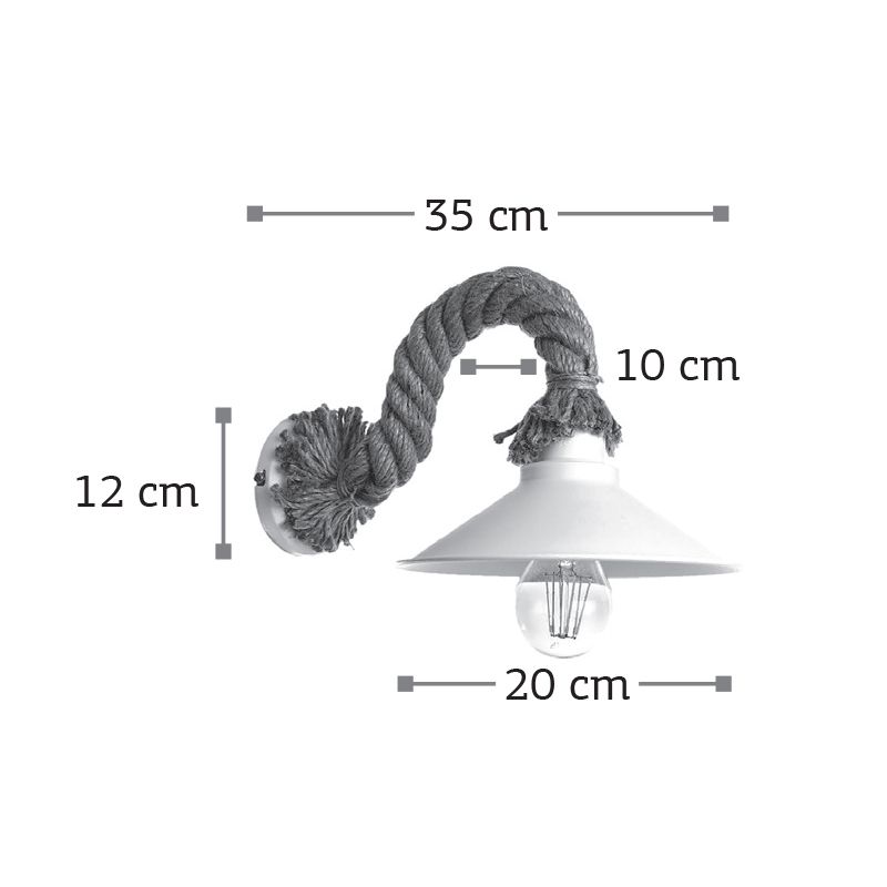 Πρόκειται για ένα επιτοίχιο φωτιστικό κατασκευασμένο από καφέ σχοινί και λευκό μέταλλο. Τοποθετείται σε οποιονδήποτε εσωτερικό χώρο, επιτρέποντας τη διάχυση του φωτός σε αυτόν. Πρόκειται για ένα επιτοίχιο φωτιστικό κατασκευασμένο από καφέ σχοινί και λευκό μέταλλο. Τοποθετείται σε οποιονδήποτε εσωτερικό χώρο, επιτρέποντας τη διάχυση του φωτός σε αυτόν.