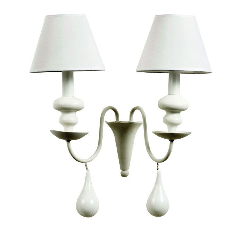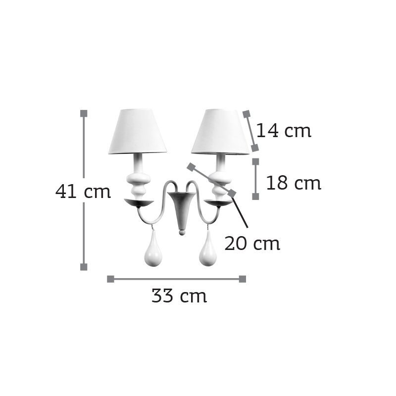 Πρόκειται για ένα λευκό μεταλλικό επιτοίχιο φωτιστικό με δύο λαμπτήρες. Την ιδιαίτερη σχεδίασή του συμπληρώνουν τα λευκά υφασμάτινα καπέλα που καλύπτουν τους λαμπτήρες αλλά και οι λευκές γυάλινες σταγόνες που κρέμονται από τους βραχίονές του. Πρόκειται για ένα λευκό μεταλλικό επιτοίχιο φωτιστικό με δύο λαμπτήρες. Την ιδιαίτερη σχεδίασή του συμπληρώνουν τα λευκά υφασμάτινα καπέλα που καλύπτουν τους λαμπτήρες αλλά και οι λευκές γυάλινες σταγόνες που κρέμονται από τους βραχίονές του.