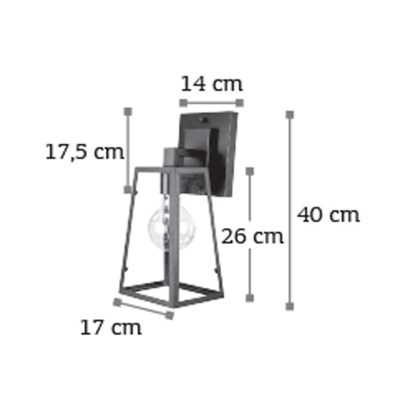 Πρόκειται για επιτοίχιο φωτιστικό κατασκευασμένο από μαύρο μέταλλο και διάφανο γυαλί. Ο τετράγωνος σχεδιασμός του το καθιστά μοντέρνο και τοποθετήσιμο σε οποιονδήποτε μοντέρνο εσωτερικό χώρο. Το διάφανο γυαλί επιτρέπει τη διάχυση του φωτός προσδίδοντας ένα άρτιο φωτεινό αποτέλεσμα.  Πρόκειται για επιτοίχιο φωτιστικό κατασκευασμένο από μαύρο μέταλλο και διάφανο γυαλί. Ο τετράγωνος σχεδιασμός του το καθιστά μοντέρνο και τοποθετήσιμο σε οποιονδήποτε μοντέρνο εσωτερικό χώρο. Το διάφανο γυαλί επιτρέπει τη διάχυση του φωτός προσδίδοντας ένα άρτιο φωτεινό αποτέλεσμα.