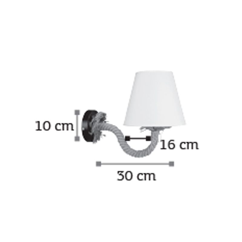 Πρόκειται για ένα επιτοίχιο φωτιστικό κατασκευασμένο από καφέ σχοινί. Η βάση του είναι από μαύρο μέταλλο, καθιστώντας το ουδέτερο και εύκολη επιλογή για ποικίλους εσωτερικούς χώρους. Το υφασμάτινο καπέλο συμπληρώνει το φωτιστικό αυτό, δίνοντας του ένα ρομαντικό ύφος.  Πρόκειται για ένα επιτοίχιο φωτιστικό κατασκευασμένο από καφέ σχοινί. Η βάση του είναι από μαύρο μέταλλο, καθιστώντας το ουδέτερο και εύκολη επιλογή για ποικίλους εσωτερικούς χώρους. Το υφασμάτινο καπέλο συμπληρώνει το φωτιστικό αυτό, δίνοντας του ένα ρομαντικό ύφος.