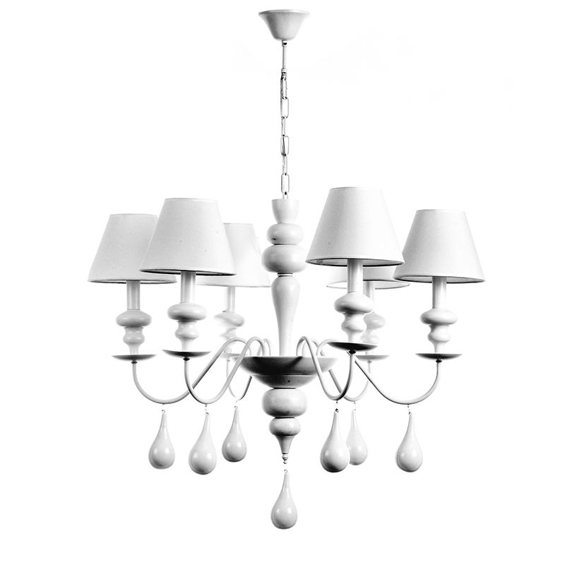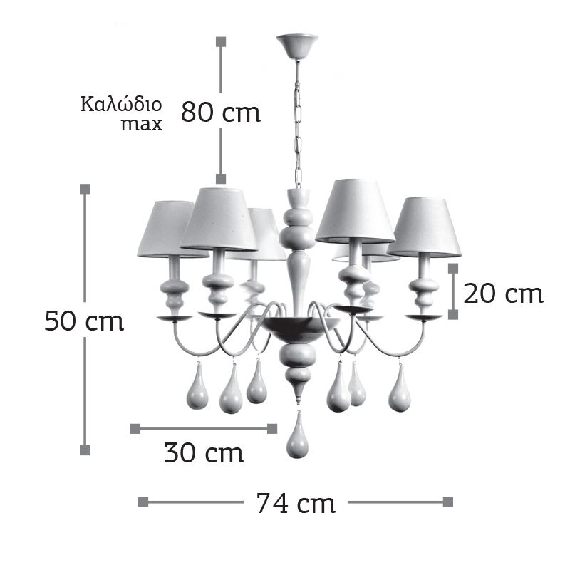 Πρόκειται για ένα λευκό μεταλλικό κρεμαστό φωτιστικό με έξι λαμπτήρες. Την ιδιαίτερη σχεδίασή του συμπληρώνουν τα λευκά υφασμάτινα καπέλα που καλύπτουν τους λαμπτήρες αλλά και οι λευκές γυάλινες σταγόνες που κρέμονται. Η ανάρτηση είναι ρυθμιζόμενη ώστε να προσαρμόζεται στον κάθε χώρο. Πρόκειται για ένα λευκό μεταλλικό κρεμαστό φωτιστικό με έξι λαμπτήρες. Την ιδιαίτερη σχεδίασή του συμπληρώνουν τα λευκά υφασμάτινα καπέλα που καλύπτουν τους λαμπτήρες αλλά και οι λευκές γυάλινες σταγόνες που κρέμονται. Η ανάρτηση είναι ρυθμιζόμενη ώστε να προσαρμόζεται στον κάθε χώρο.