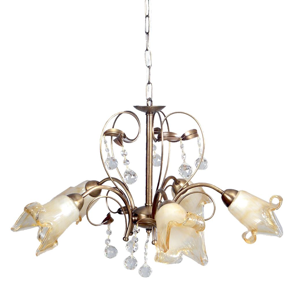 Πρόκειται για ένα κρεμαστό φωτιστικό από οξυντέ μέταλλο και πέντε λαμπτήρες. Τα μελί γυαλιά καλύπτουν τους λαμπτήρες και τα διάφανα κρύσταλλα του δίνουν μια επιπλέον λάμψη. Η μεταλλική ανάρτηση είναι ρυθμιζόμενη για να προσαρμοστεί στον κάθε χώρο. Πρόκειται για ένα κρεμαστό φωτιστικό από οξυντέ μέταλλο και πέντε λαμπτήρες. Τα μελί γυαλιά καλύπτουν τους λαμπτήρες και τα διάφανα κρύσταλλα του δίνουν μια επιπλέον λάμψη. Η μεταλλική ανάρτηση είναι ρυθμιζόμενη για να προσαρμοστεί στον κάθε χώρο.
