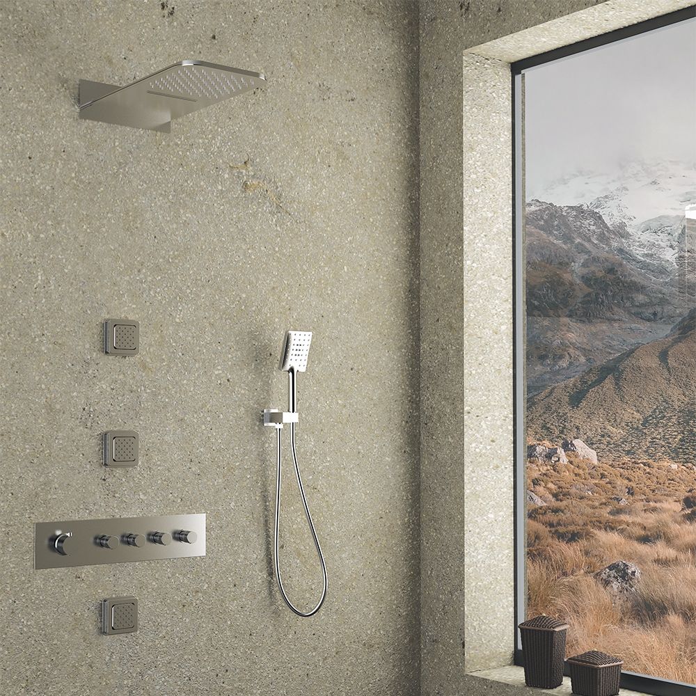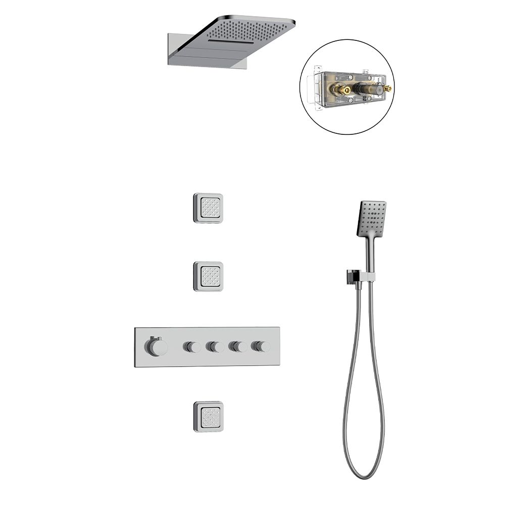 Θερμοστατικό σετ εντοιχισμού, 4-εξόδων, χρωμέ με άριστη ποιότητα επινικέλωσης 5 στρωμάτων, που εγγυάται ευκολία στο καθάρισμα και λάμψη για πολλά χρόνια χρήσης. Ορθογώνια κεφαλή ντουζ με καταρράκτη που κατασκευάζεται από 304 ανοξείδωτο ατσάλι. Συνοδεύονται από 3 τετράγωνα ορειχάλκινα jet, επιτοίχια παροχή με στήριγμα τηλεφώνου από ορείχαλκο και μοντέρνο, ABS τηλέφωνο ντουζ με ορθογώνια κεφαλή σε χρωμέ φινίρισμα σετ με εύκαμπτο χρωμέ, ορειχάλκινο smooth σπιράλ. Συνοδεύεται από 5-ετή γραπτή εργοστασιακή εγγύηση και υποστηρίζεται από πλήρη γκάμα ανταλλακτικών.