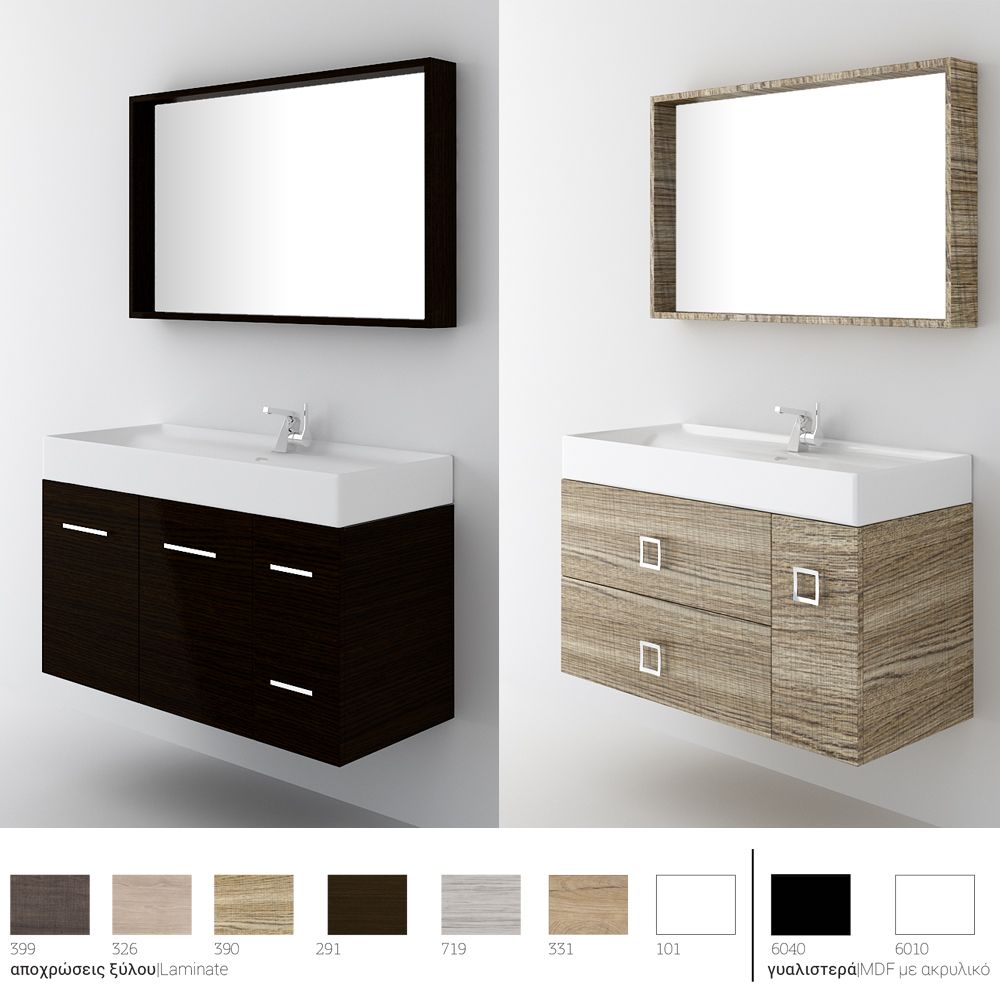 Υλικό επίπλου μελαμίνη με PVC για μεγαλύτερη αντοχή στο χρόνο και σε μεγάλη γκάμα χρωματικών επιλογών. Χρήση μηχανισμών κλεισίματος soft close και blumotion (σε συρτάρια) που φέρουν την υπογραφή της κορυφαίας εταιρείας BLUM. Διατίθεται με ντουλάπι καθρέπτη με δύο πόρτες ή με καθρέπτη εταζέρα που μπορεί να πλαισιωθεί από δύο πρόσθετα ντουλάπια 25 εκατοστών. Ο καθρέπτης Infinity αποτελεί μια τρίτη επιλογή χωρίς αποθηκευτικό χώρο. Ο τελευταίος βγαίνει μόνο σε αποχρώσεις ξύλου Laminate. Συμπεριλαμβάνονται στη βάση δύο, τρείς ή τέσσερεις, χρωμέ λαβές επίπλων, δικής σας επιλογής σε τρία σχέδια, ανάλογα με τη μορφολογία της βάσης. Ενώ υπάρχει δυνατότητα προσθήκης στο πακέτο μαύρων ματ γραμμικών λαβών, κατόπιν επιλογής. Στην περίπτωση τεσσάρων συρταριών ή μιας πόρτας και δύο συρταριών μπορείτε να επιλέξετε ανάμεσα στα πόμολα Μ1, Μ4 ή Μ5 ή σε μαύρο πόμολο M1. Σε βάση με δύο πόρτες μπορεί να τοποθετηθούν πόμολα χρωμέ, γραμμικά, L1, L2 ή L3 ή μαύρο ματ L1. Και τέλος στην περίπτωση βάσης με δύο πόρτες – δύο συρτάρια τα πόμολα σε χρωμέ απόχρωση είναι φιξαρισμένα, γραμμικά (S1,M1) αλλά μπορείτε να αλλάξετε την εικόνα του επίπλου σας προσθέτοντας μαύρα ματ πόμολα (S1,M1). Ομοίως μπορείτε να συνδυάσετε φωτιστικό επίπλου σε χρωμέ ή μαύρη απόχρωση. Η συνολική σύνθεση του επίπλου αποστέλλεται συναρμολογημένη σε 3 τεμάχια (βάση, νιπτήρας και καθρέπτης) και σε περίπτωση που επιλέξετε στήλες μπάνιου για να αυξήσετε τους αποθηκευτικούς χώρους στο μπάνιο σας, αυτές παραδίδονται συναρμολογημένες. Κατόπιν επιλογής, η σύνθεση μπορεί να συνοδευτεί με γραμμικό φωτιστικό μπάνιου Led 40 ή 60 εκατοστά ισχύος 8 και 12 watt αντιστοίχως, σε χρωμέ ή και μαύρο ματ χρώμα. Στην τιμή του νιπτήρα δεν συμπεριλαμβάνεται η μπαταρία και η βαλβίδα του νιπτήρα, μπορείτε να προσθέσετε ορειχάλκινη, βαλβίδα κλικ-κλακ για νιπτήρες με υπερχείλιση. Ομοίως μπορείτε να προσθέσετε μπαταρία νιπτήρος που φέρει την υπογραφή κορυφαίων εταιρειών στο σχεδιασμό ειδών υγιεινής, όπως Pentagono, Orabella by Armando Vicario και Orabella.