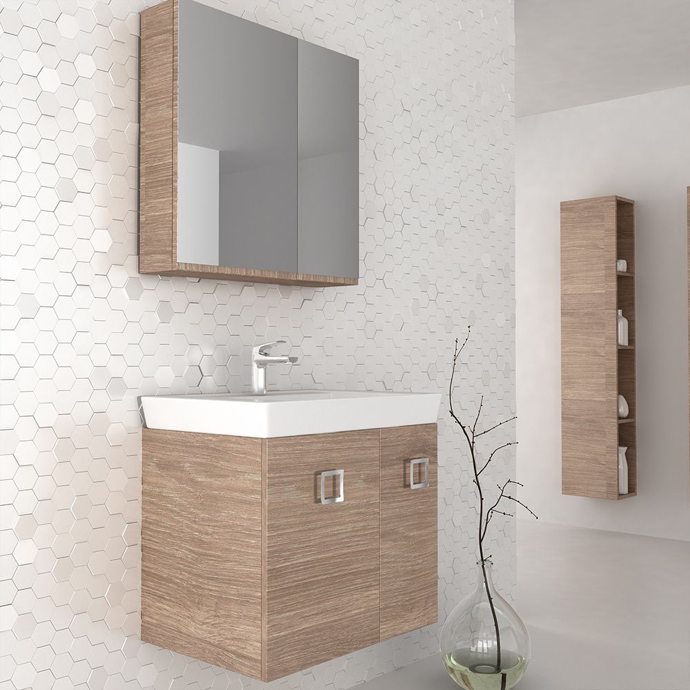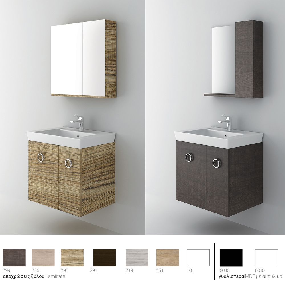 Κρεμαστό έπιπλο μπάνιου Vanity 65 – σειρά επίπλων Alternative. Ένα έπιπλο μπάνιου, βαρέως τύπου ιδανικό για οικιακή χρήση. Αποτελείται από, κρεμαστή βάση με δύο πόρτες με μηχανισμούς κλεισίματος soft close και νιπτήρα από πορσελάνη. Η βάση διατίθεται και σε επιδαπέδια (Vanity 65 Long). Μπορείτε να ολοκληρώσετε την εικόνα του επίπλου προσθέτοντας καθρέπτη δικής σας επιλογής (ντουλάπι, εταζέρα με ντουλαπάκι ή καθρέπτη με πλαίσιο) και τα πόμολα που ταιριάζουν στο δικό σας μπάνιο. Όλα τα έπιπλα της εταιρείας Orabella μπορούν να πάρουν στήλες μπάνιου επιδαπέδιες ή κρεμαστές για επιπλέον χώρο αποθήκευσης, ενώ υπάρχει δυνατότητα προσθήκης ντουλαπιού πλυντηρίου σε χρώμα δικής σας επιλογής. Διατίθεται σε έξι διαφορετικές αποχρώσεις ξύλου και σε λευκό χρώμα- Laminate καθώς και σε μαύρο και λευκό γυαλιστερό και ματ ακρυλικό σε mdf. Κατόπιν επιλογής, μπορεί να συνοδευτεί με γραμμικό φωτιστικό μπάνιου Led.