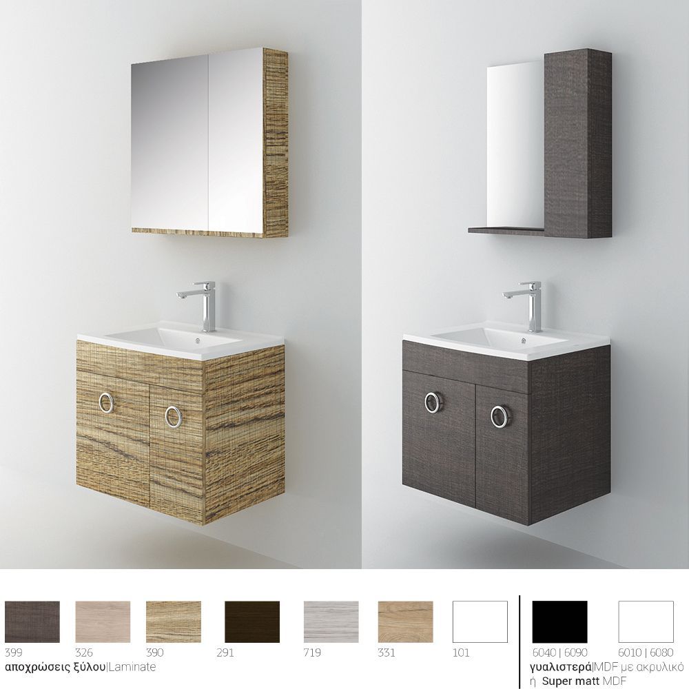 Κρεμαστό έπιπλο μπάνιου Vero 65 – σειρά επίπλων Alternative. Ένα έπιπλο μπάνιου, βαρέως τύπου ιδανικό για οικιακή χρήση. Αποτελείται από, κρεμαστή βάση με δύο πόρτες με μηχανισμούς κλεισίματος soft close και νιπτήρα από πορσελάνη. Μπορείτε να ολοκληρώσετε την εικόνα του επίπλου προσθέτοντας καθρέπτη δικής σας επιλογής (ντουλάπι, εταζέρα με ντουλαπάκι, καθρέπτη με πλαίσιο ή καθρέπτη Led) και τα πόμολα που ταιριάζουν στο δικό σας μπάνιο. Όλα τα έπιπλα της εταιρείας Orabella μπορούν να πάρουν στήλες μπάνιου επιδαπέδιες ή κρεμαστές για επιπλέον χώρο αποθήκευσης, ενώ υπάρχει δυνατότητα προσθήκης ντουλαπιού πλυντηρίου σε χρώμα δικής σας επιλογής. Διατίθεται σε έξι διαφορετικές αποχρώσεις ξύλου και σε λευκό χρώμα Laminate καθώς και σε μαύρο και λευκό γυαλιστερό και ματ mdf. Κατόπιν επιλογής, μπορεί να συνοδευτεί με γραμμικό φωτιστικό μπάνιου Led.