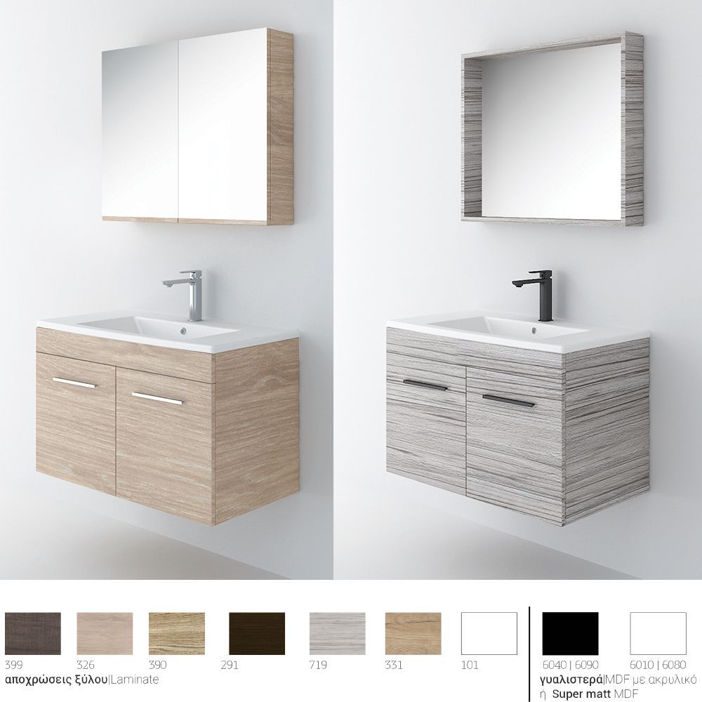 Υλικό επίπλου μελαμίνη με PVC ή MDF με ακρυλικό (γυαλιστερό) ή MDF (ματ) για μεγαλύτερη αντοχή στο χρόνο και σε μεγάλη γκάμα χρωματικών επιλογών. Χρήση μηχανισμών κλεισίματος soft close, που φέρουν την υπογραφή της κορυφαίας εταιρείας BLUM. Διατίθεται με ντουλάπι καθρέπτη με δύο πόρτες ή με καθρέπτη εταζέρα που μπορεί να πλαισιωθεί από ένα πρόσθετο ντουλάπι 20 εκατοστών. Ο καθρέπτης Infinity αποτελεί μια τρίτη επιλογή χωρίς αποθηκευτικό χώρο. Ο τελευταίος βγαίνει μόνο σε αποχρώσεις ξύλου Laminate. Συμπεριλαμβάνονται στη βάση δύο, χρωμέ λαβές επίπλων, δικής σας επιλογής σε τρία σχέδια (M1, M4, M5). Ενώ υπάρχει δυνατότητα προσθήκης στο πακέτο μαύρων ματ γραμμικών λαβών κατόπιν επιλογής (Μ1). Ομοίως μπορείτε να συνδυάσετε φωτιστικό επίπλου σε χρωμέ ή μαύρη απόχρωση. Η συνολική σύνθεση του επίπλου αποστέλλεται συναρμολογημένη σε 3 τεμάχια (βάση, νιπτήρας και καθρέπτης) και σε περίπτωση που επιλέξετε στήλες μπάνιου για να αυξήσετε τους αποθηκευτικούς χώρους στο μπάνιο σας, αυτές παραδίδονται συναρμολογημένες. Κατόπιν επιλογής, η σύνθεση μπορεί να συνοδευτεί με γραμμικό φωτιστικό μπάνιου Led 40 ή 60 εκατοστά ισχύος 8 και 12 watt αντιστοίχως, σε χρωμέ ή και μαύρο ματ χρώμα. Εναλλακτικά μπορείτε να επιλέξετε καθρέπτη με κρυφό φωτισμό LED. Στην τιμή του νιπτήρα δεν συμπεριλαμβάνεται η μπαταρία και η βαλβίδα του νιπτήρα, μπορείτε να προσθέσετε ορειχάλκινη, βαλβίδα κλικ-κλακ για νιπτήρες με υπερχείλιση. Ομοίως μπορείτε να προσθέσετε μπαταρία νιπτήρος που φέρει την υπογραφή κορυφαίων εταιρειών στο σχεδιασμό ειδών υγιεινής, όπως Pentagono, Orabella by Armando Vicario και Orabella.