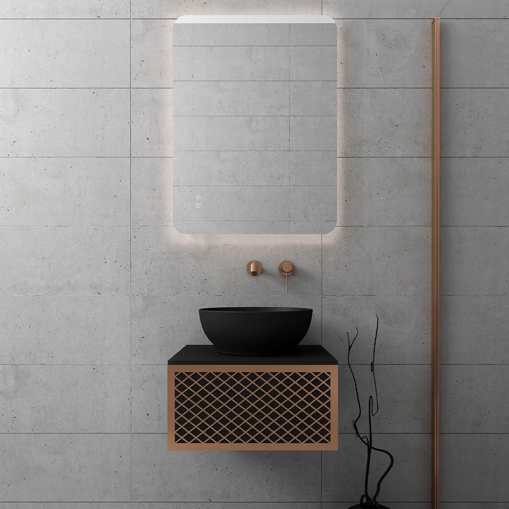 Υλικό επίπλου MDF super matt, anti-spot, για μεγαλύτερη αντοχή στο χρόνο. Ανακλινόμενο πορτάκι με χρωμέ κουμπάσο, δύο μεντεσέδες (χρωμέ ή μαύροι ανάλογα με το χρώμα της βάσης) και μηχανισμό ανοίγματος push. Ο πάγκος κατασκευάζεται από υλικά ματ υψηλής αντοχής στην κρούση, στην κάμψη και στην τριβή με σχεδόν μηδενική απορρόφηση υγρασίας. Προτείνεται η επιλογή καθρέπτη LED με κρυφό φωτισμό και 2 κουμπιά με αισθητήρες αφής on/off και anti-fog αντιθαμβωτικό σύστημα με δυνατότητα επιλογής θερμοκρασίας χρώματος φωτός. Στην τιμή δεν συμπεριλαμβάνεται ο νιπτήρας, η μπαταρία και η βαλβίδα του νιπτήρα. Mπορείτε να προσθέσετε επικαθήμενο νιπτήρα και ορειχάλκινη βαλβίδα κλικ-κλακ για νιπτήρες χωρίς υπερχείλιση. Ομοίως μπορείτε να προσθέσετε μπαταρία νιπτήρος που φέρει την υπογραφή κορυφαίων εταιρειών στον σχεδιασμό ειδών υγιεινής, όπως Pentagono, Orabella by Armando Vicario και Orabella. Προσοχή: οι επικαλύψεις παραδίδονται ατρύπητες.