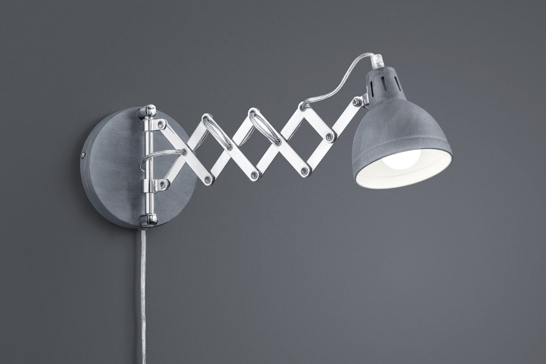 The SCISSOR wall light impresses with its unique design. Thanks to the use of a scissor joint, the light can be used in a variety of ways. It also has a cable feed of approx. 1.5 metres. The lamp arm can be extended to a maximum width of 53 cm. The lamp arm can also be swivelled and the lamp head can be tilted. The combination of chrome with the simple concrete colour allows the light to be combined with many furnishing styles. For energy-saving lighting, it is recommended to use an LED illuminant. These are an optimal alternative to conventional halogen lamps and stand for a high quality of light and energy savings of up to 80%. In addition, LED lamps help you benefit from a long service life, low heat generation and at the same time protect the environment.