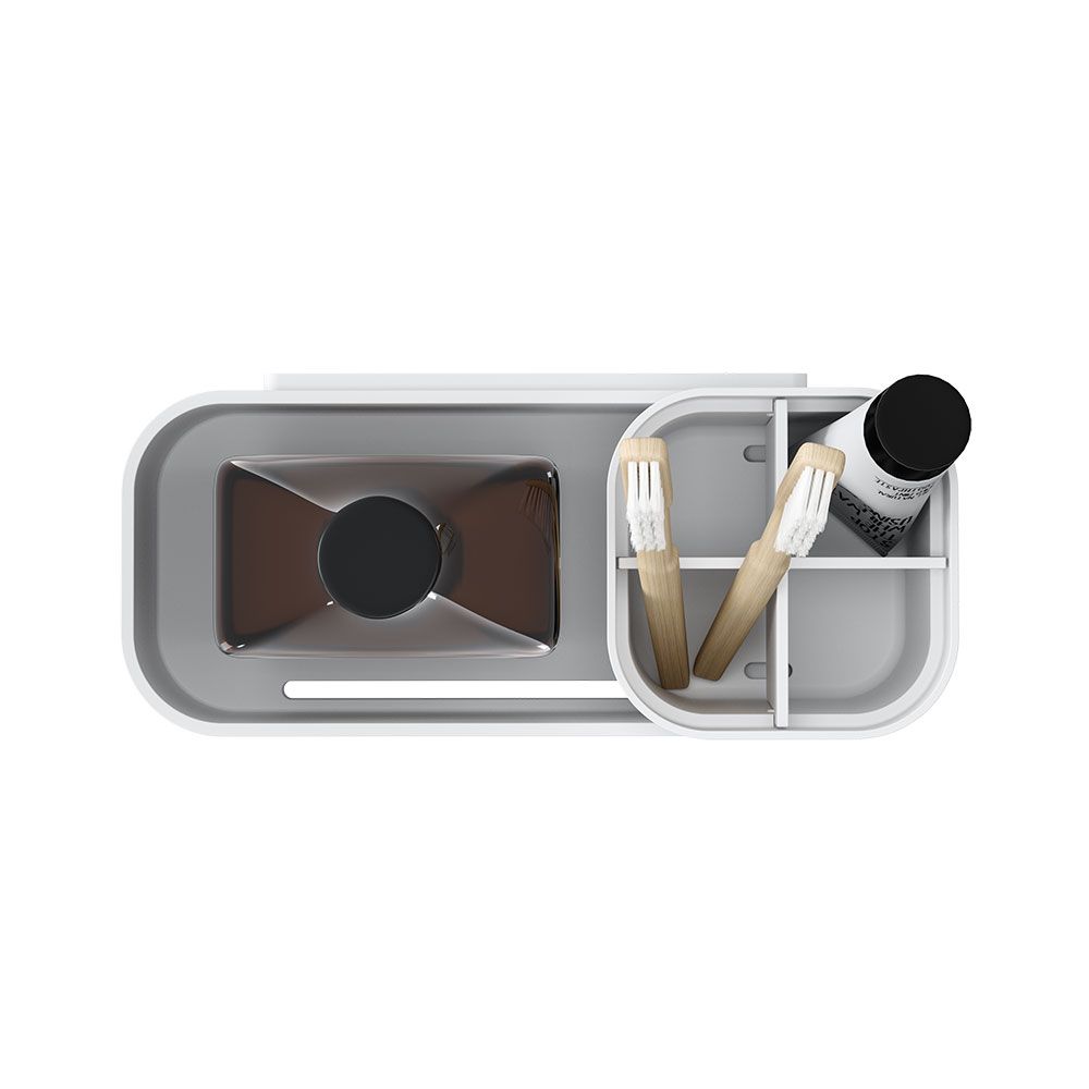 Γάντζος για την πετσέτα σας; Βουρτσίζετε τα δόντια σας στο ντους; Κανένα πρόβλημα. Αυτός ο δίσκος αποθήκευσης από τη σειρά 2-Store είναι η απάντησή σας σε όλα τα προβλήματα αποθήκευσης. Προσαρμοσμένο στις ανάγκες του μπάνιου σας: πολυλειτουργικό και ιδιοφυές όσον αφορά την αποθήκευση. Πρακτικό και μοντέρνο σε λευκό.