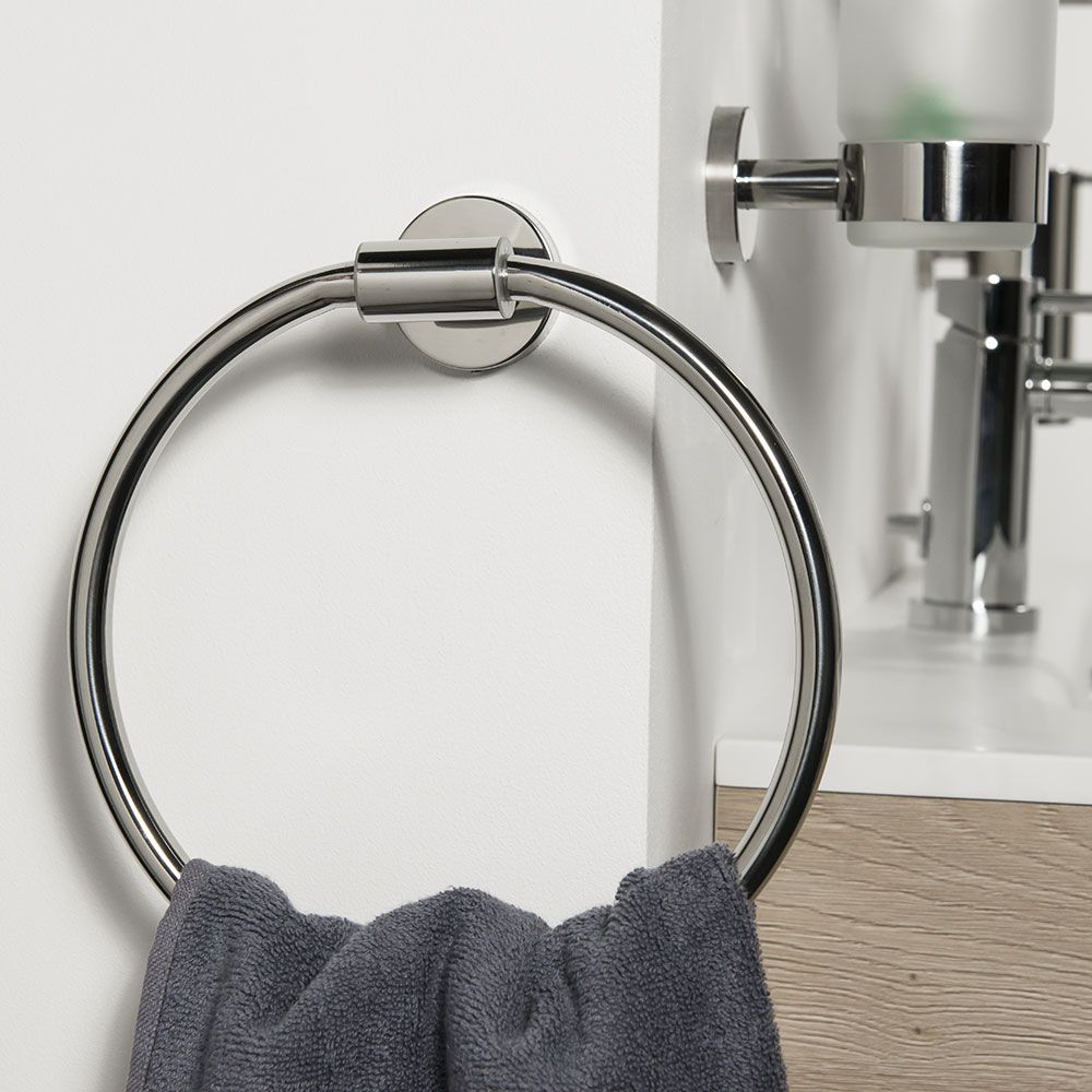 Το δαχτυλίδι πετσετών της σειράς Tiger Boston είναι κατασκευασμένο από ανοξείδωτο ατσάλι με γυαλισμένο φινίρισμα και διαθέτει περιστρεφόμενο δακτύλιο στο οποίο κρεμάτε πετσέτες. Το εξάρτημα μπορεί εύκολα να τοποθετηθεί στον τοίχο και το υλικό στερέωσης (περιλαμβάνεται) κρύβεται μετά την τοποθέτηση για κομψή εμφάνιση. Η σειρά Boston περιλαμβάνει μια μεγάλη ποικιλία από άλλα αξεσουάρ για το μπάνιο και την τουαλέτα, όλα όμορφα συνδυασμένα.